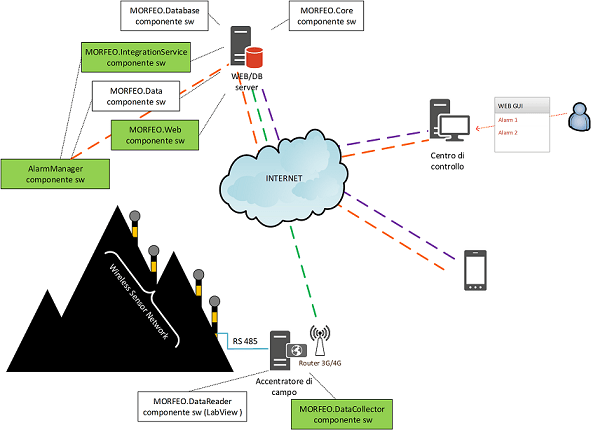 The main objective of the MORFEO software is to make available useful information for emergency management in the pre-event and alert phases. The software system operates through four main components: Morfeo Data Collector (MDC) installed on the centralizing computer that collects the data detected by the WSN; Morfeo Integration Service (MIS) that receives the data from the MDC, stores them in a database and possibly interacts with an Alarm Manager (AM) that manages the life cycle of the alarms; Morfeo Web (MW), whose purpose is to interact with the operators for the visualization of the data.